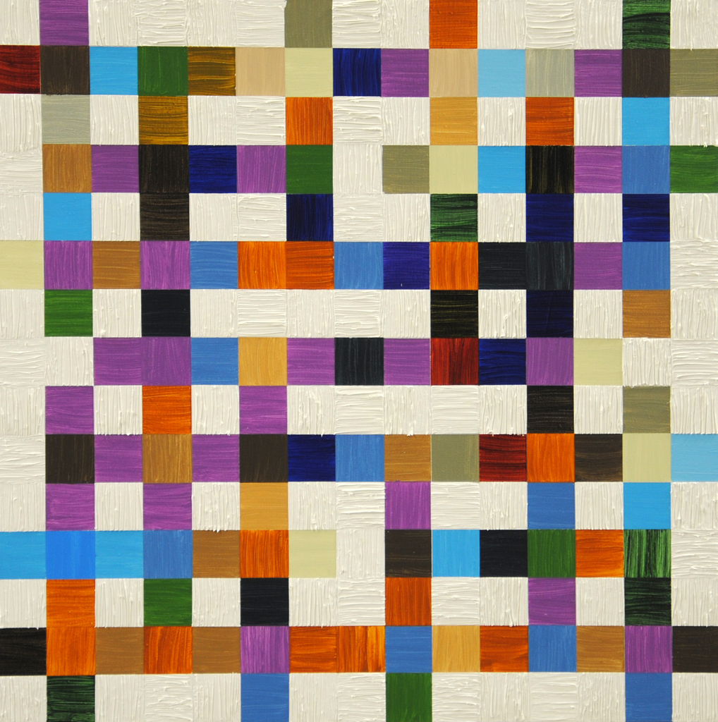 Thema: Chaos (Geometrische Chaos) Mijn kunst is beïnvloedt door de moderne wiskundige en wetenschappelijke benadering van het begrip complexe orde van de natuur. Met name heb ik me verdiept in de Chaos theorie en de fractal geometrie. Ik ben geen wiskundige, en ik gebruik geen wiskundige formules. De ideeën van de Chaos theorie en fractal geometrie leiden tot de ontwikkeling van de composities in mijn werk. Ik gebruik driehoeken,vierkanten en cirkels in mijn schilderijen, maar in mijn huidige serie, geoChao richt ik me alleen op de vierkanten en de verhoudingen tussen de vierkanten. Ik ontwikkel mijn composities door kleine vierkantjes op grote te zetten of grote op kleine te zetten. Het gaat om de onderlinge verhoudingen tussen de vierkanten. Ik laat de methode die ik kies de compositi