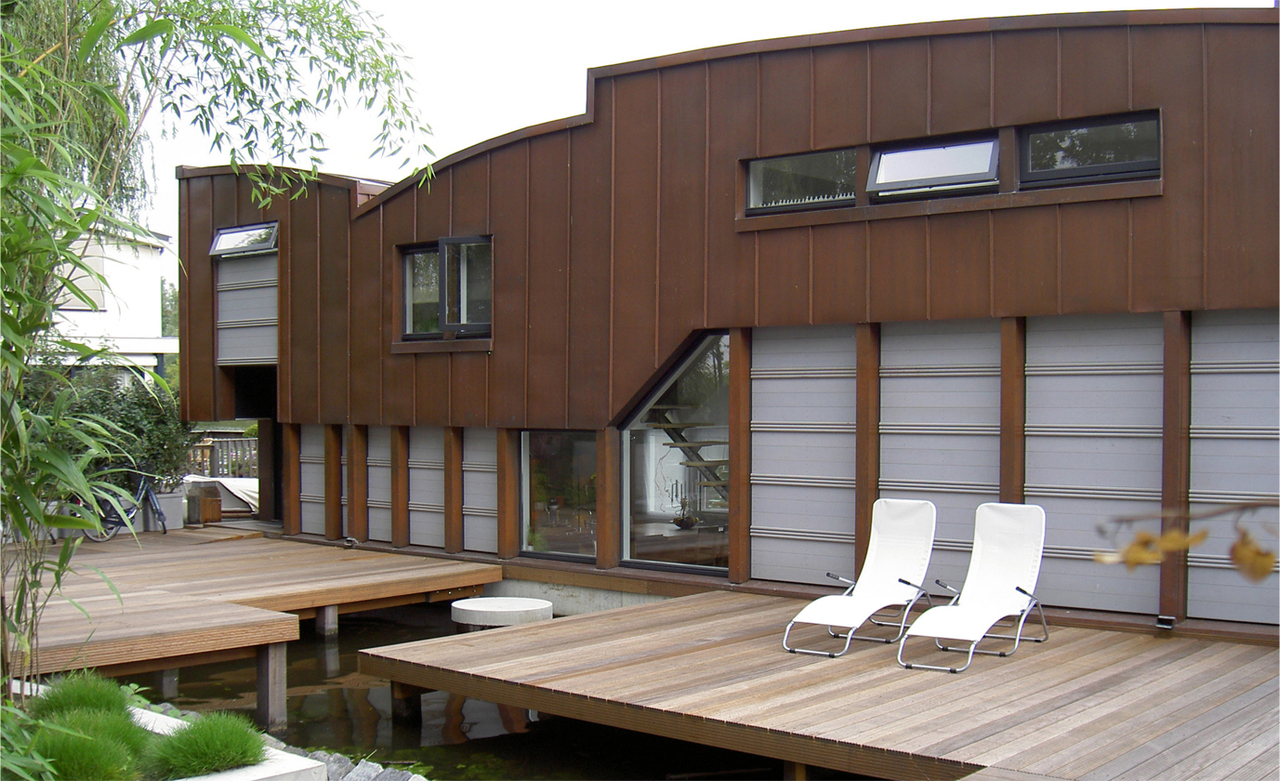 The Ark exists of three layers built in a splitlevel concept. The construction is a slim steel frame covered with copper walls and roofs.