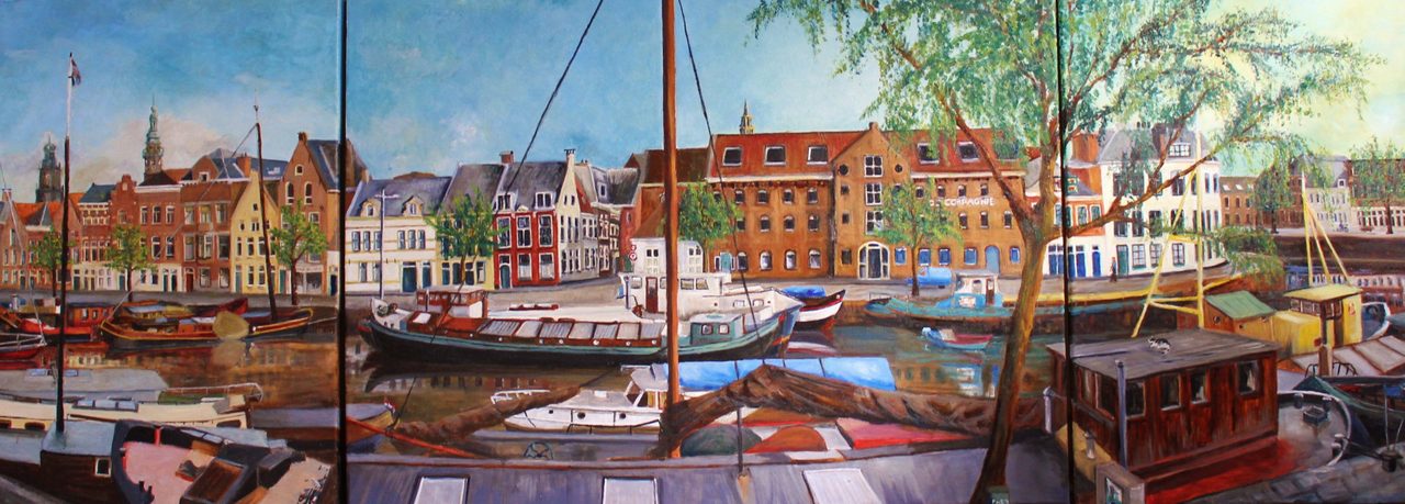 Uitzicht op Noorderhaven in Groningen. Een van de laatste vrijhavens van Nederland geschilderd op drie doeken.