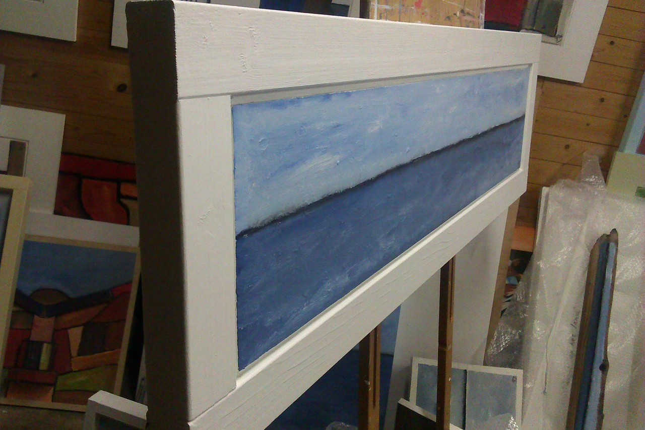 Zeeschildering in panoramaformaat. Je moet het breed zien. Totale afmeting incl. lijst 40 x 125 x 5 cm. VERKOCHT.