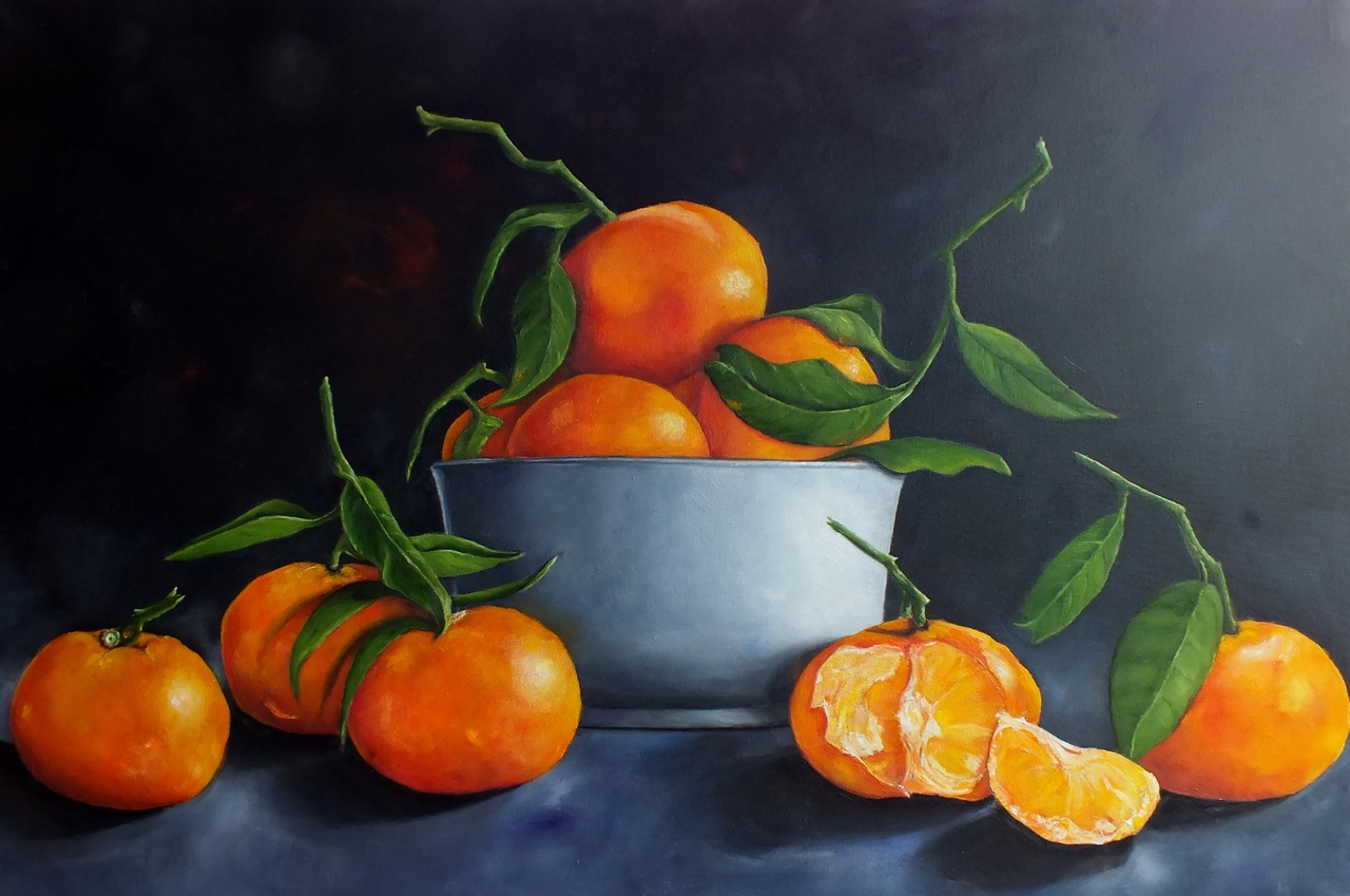 Het groen van de blaadjes is een mooie combinatie met het oranje/geel van de mandarijnen tegen een donkere achtergrond