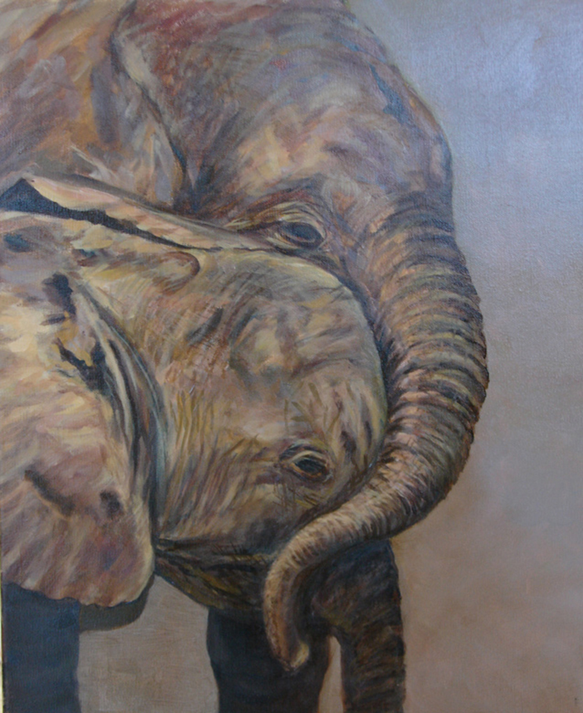 Wildlife schilderij, Olifant, moeder en kind, olieverf schilderij in lijst