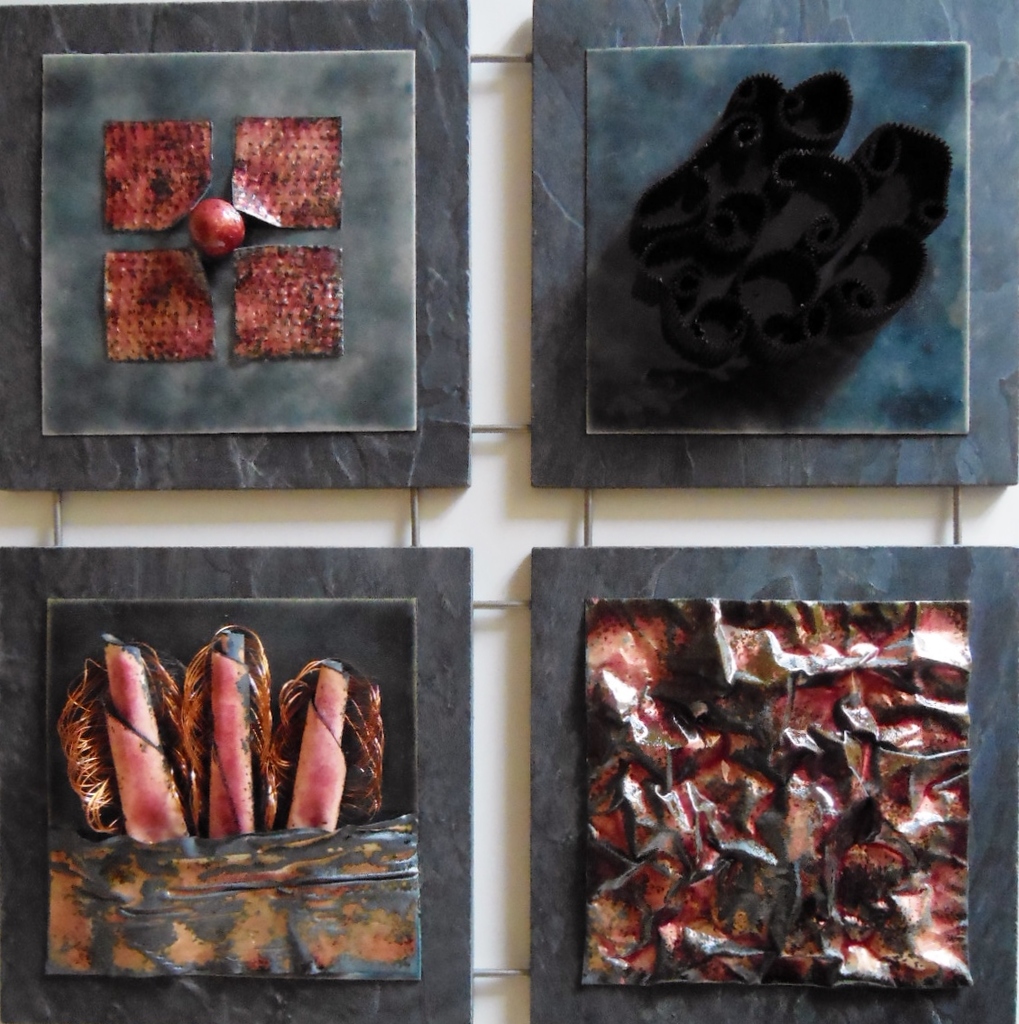Experimenten met koperfolie op geëmailleerd staalplaat.