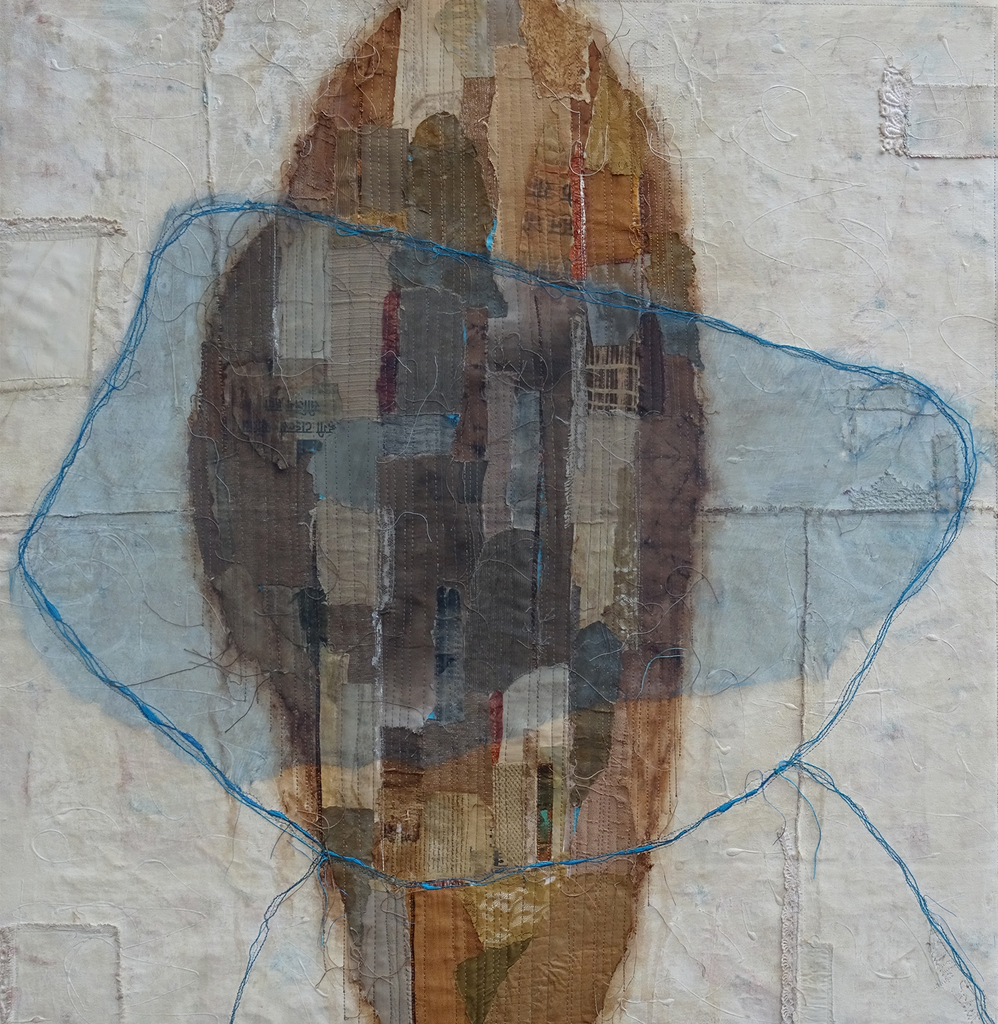 Menselijke verbinding. Gemaakt in mixed media: o.a. verf, stof, kant, latoen koper, papier, vrij machinaal borduurwerk