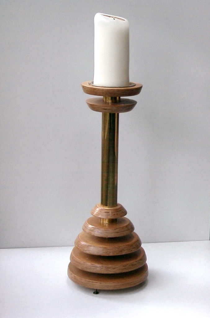 Kandelaar met een voet van beukenmultiplex schijven. De kolom is van messing. (autonoom ontwerp O0009, max.5)