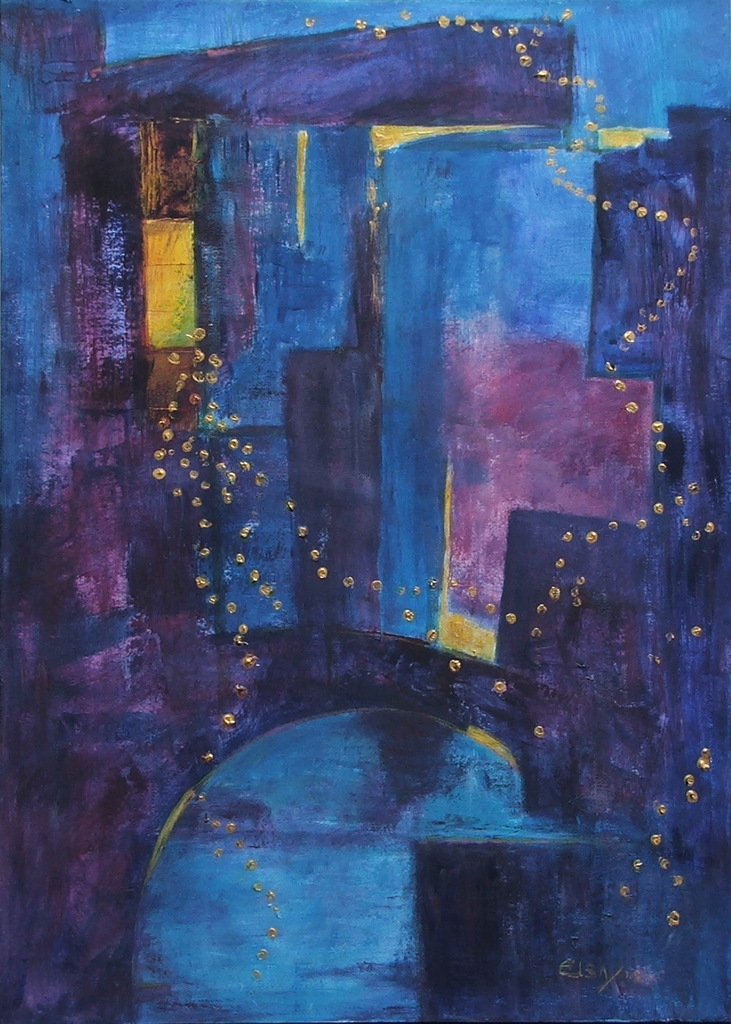 De avond is gevallen over de stad. Er klinkt muziek uit een openstaand raam. Er worden vormen verhuld, sommige juist verlicht. Niet alles is even duidelijk, de nacht is een andere wereld. Acryl, maroufflé.