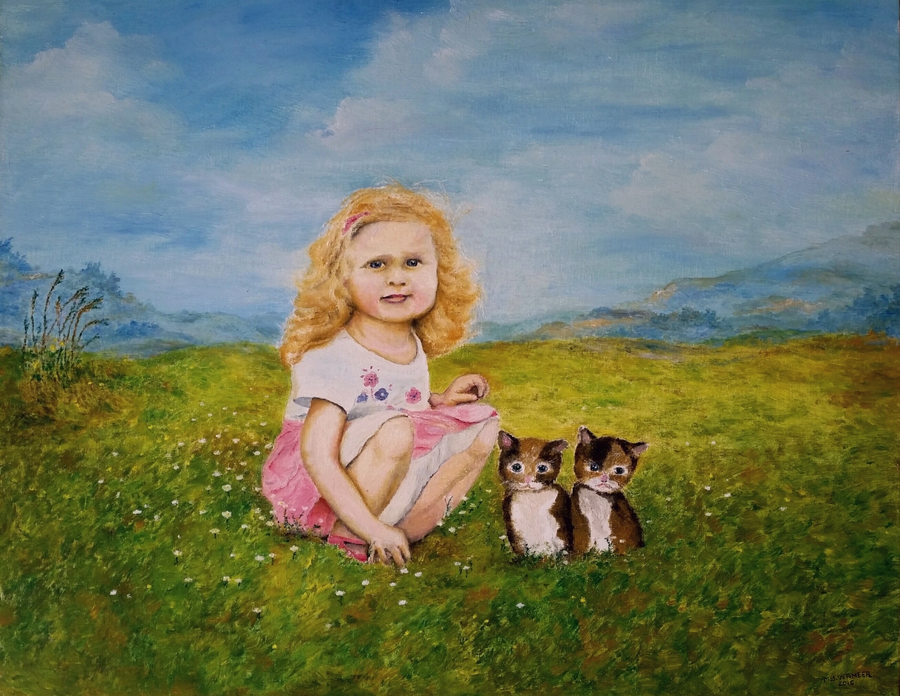 Kind in een landschap met 2 katjes.