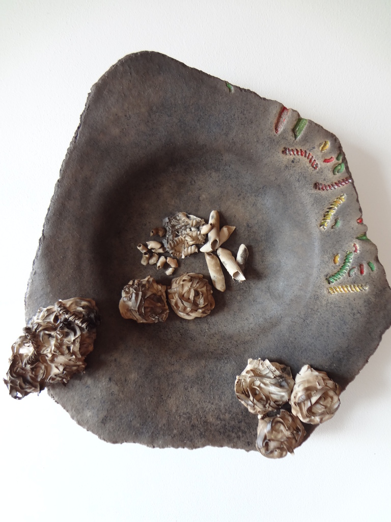 Mijn keramiek is rond, gebogen, zacht en geleidelijk verlopend met verrassende details van laagsgewijs opgebouwde onderdelen die juist speciale aandacht krijgen. Ik laat me uitdagen door het zogenaamde primitieve stoken; pitfire en naked raku.