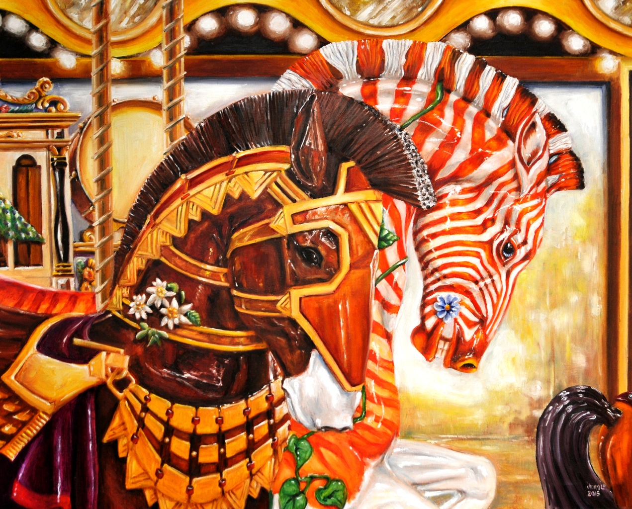 Dit olieverfschilderij is uitgevoerd met kwaliteitsverf op handgemaakt Vlaams linnen en stelt twee gesculpteerde kermispaarden voor uit de Albany Brass Ring Carousel (US). Het bijzondere aan deze carrousel is dat hij door vrijwilligers geheel met de hand wordt uitgevoerd met de technieken van de Dentzel carrousels van het begin van de vorige eeuw.