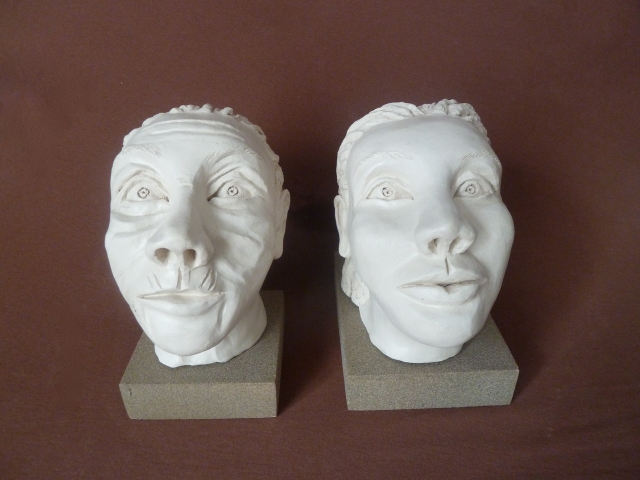 Witte vrouwenkopjes op zandkleurige houten sokkel die veroudering voostellen.