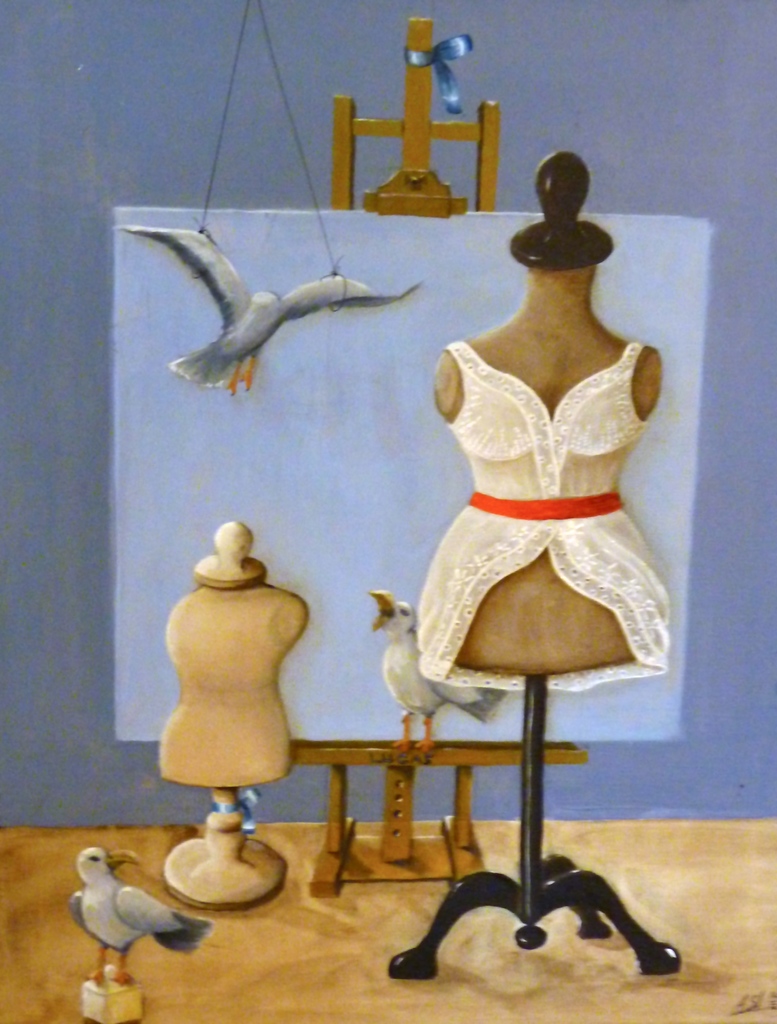 Zee Sea Paspop Oma Grandma Seagull Zeemeeuw Beach Strand Kant Lace Blue Ribbon Blauwe Strik Surrealistic Surrealistisch