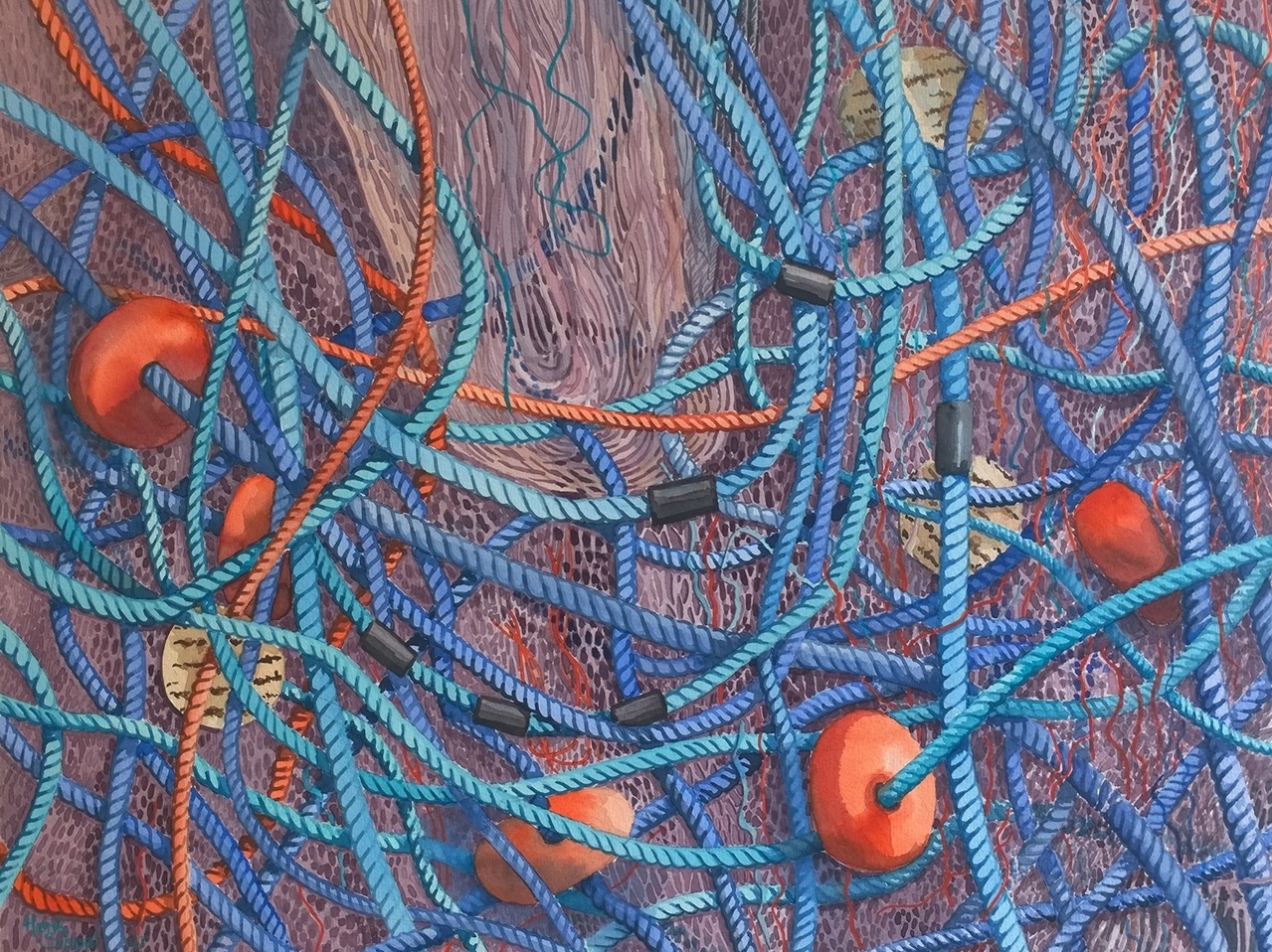 Een compositie van neergesmeten touwwerk, visnetten, wat drijvers in onranje en blauw