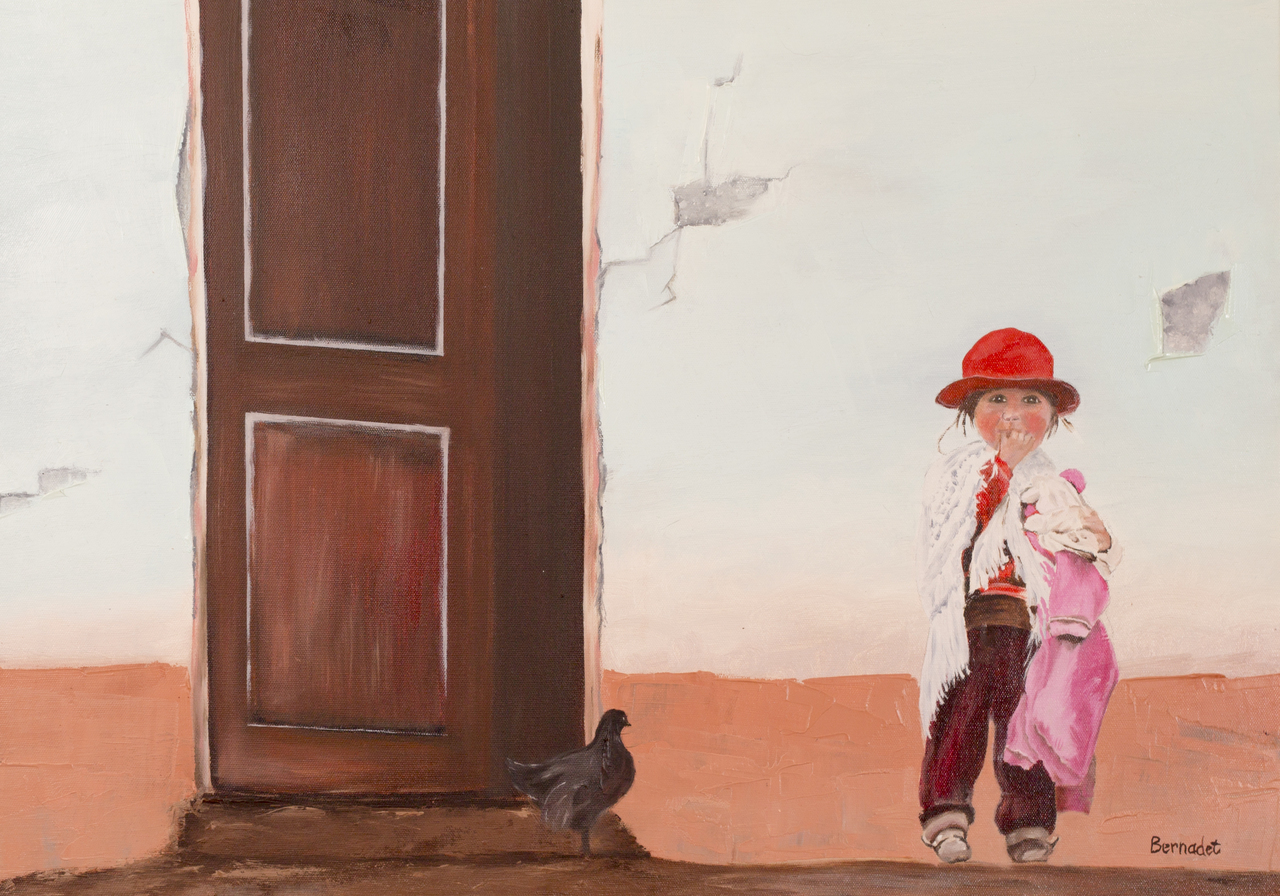 meisje Bolivia, 40x50, met 'steenrood'houten lijst olieverf