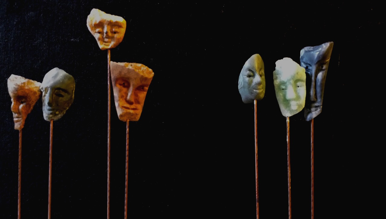 Verschillende steensoorten. Hele kleine kopjes van 2 a 3 cm. op hoge pinnen.