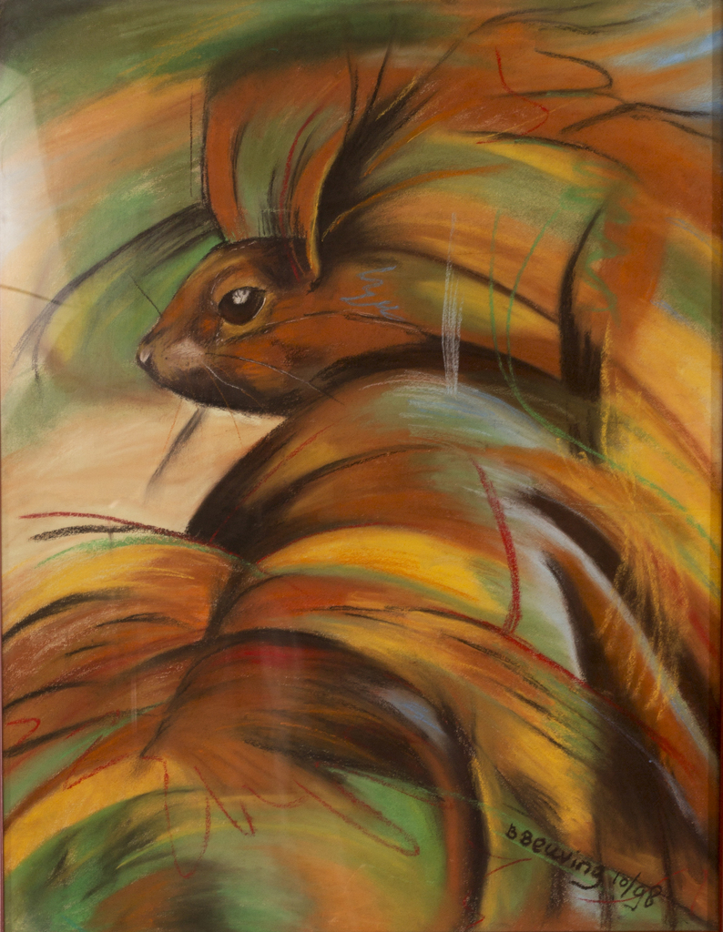 Eekhoorn , 70x50 , pasteltekening , ingelijst in bruine lijst achter glas