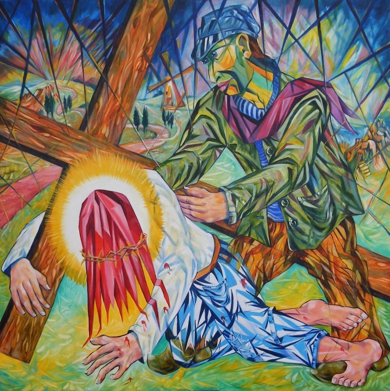 Zevende statie: Jezus valt voor de tweede maal onder het kruis. Zijn krachten vloeien steeds verder uit Jezus weg. Uitgeput valt hij onder het kruis tegen de grond. Simon van Cyrene is nu wel bereid om te helpen en met zijn stevige handen trekt hij het kruis van de vermoeide Jezus, zodat deze niet vermorzeld wordt onder de zware last van het kruis.