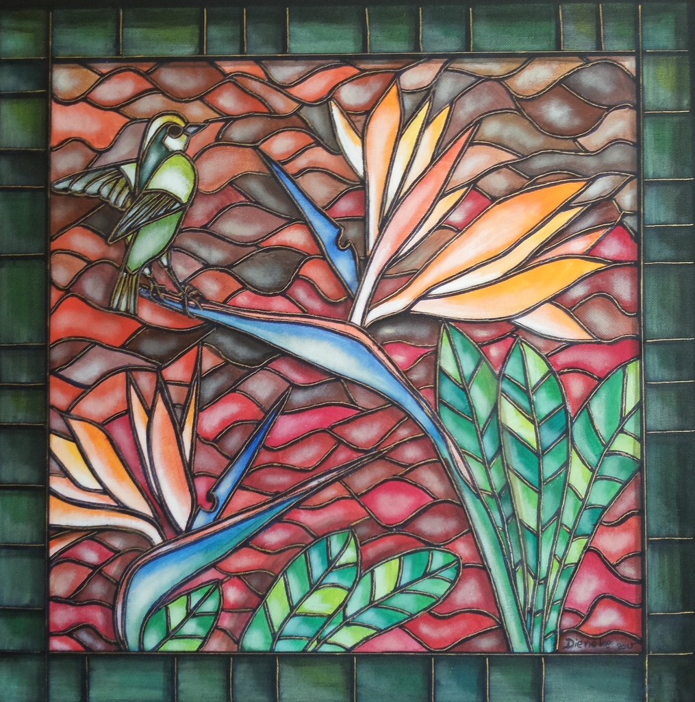Rood Oranje Vogel Groen Glas Lood In Bloem Paradijsvogelbloem