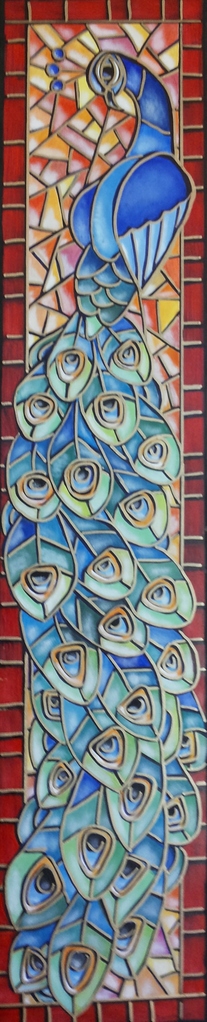 Een kleurrijke pauw, geschilderd in glas in lood stijl.