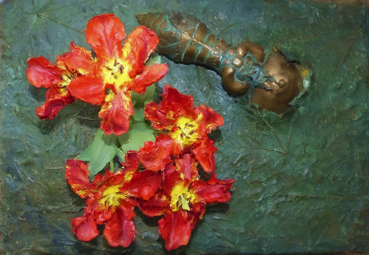 Tulpen uit de tuin op een brons van Joop Snoep