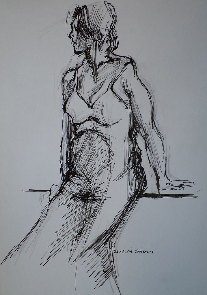 vrouw in jurk, direct getekend met pen.