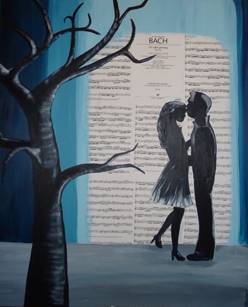 Liefdestafereel met op de achtergrond bladmuziek van J.S. Bach ''Ich habe genug''