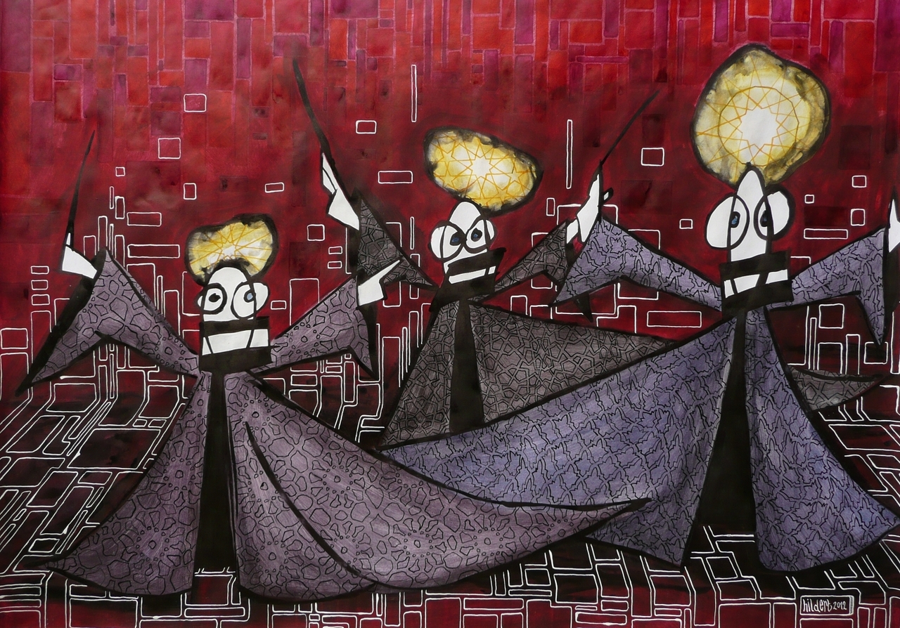 Als een postmoderne alchimist mengt Hildert Raaijmakers de beeldtaal van de microchip, klassieke profielen van mythologische halfgoden, baardige zeebonken en fabeldieren met een snuif middeleeuwse kleurensymboliek. Schrifttekens, pixels, ijle landschappen en cartoonelementen benadrukken de magie van zijn monumentale tableaus.