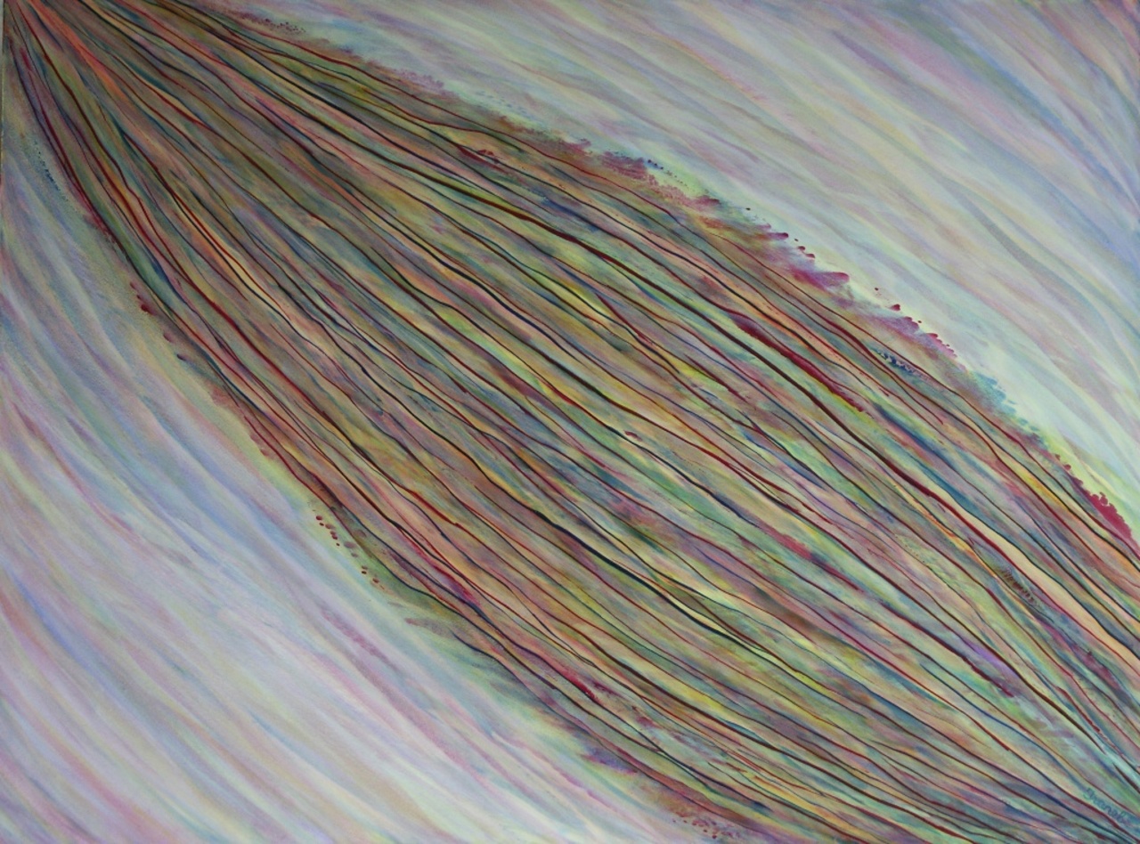 Dit werk is zonder vooropgezet plan op deze wijze uit de verf gekomen. De lijnen liggen er in duidelijke structuur bovenop. De prijs is inclusief alumium lijst.