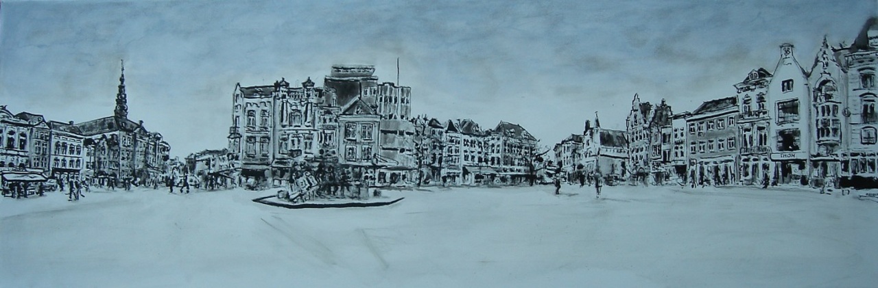 Skyline markt s-Hertogenbosch', getekend en geschilderd met rietpen en penseel in Oost-Indische inkt op doek 40x120 cm. Zwart, wit en grijs