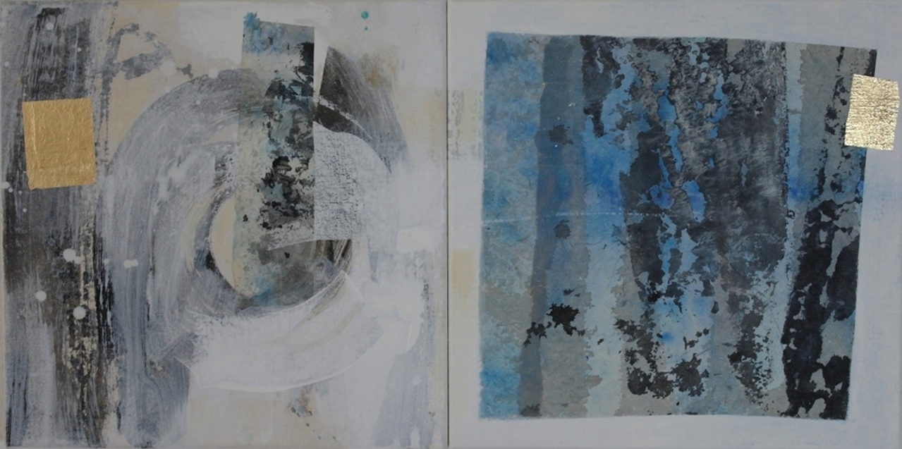Abstract tweeluik - Gemengde techniek met bladgoud op linnen doek ( op aluminium frame)