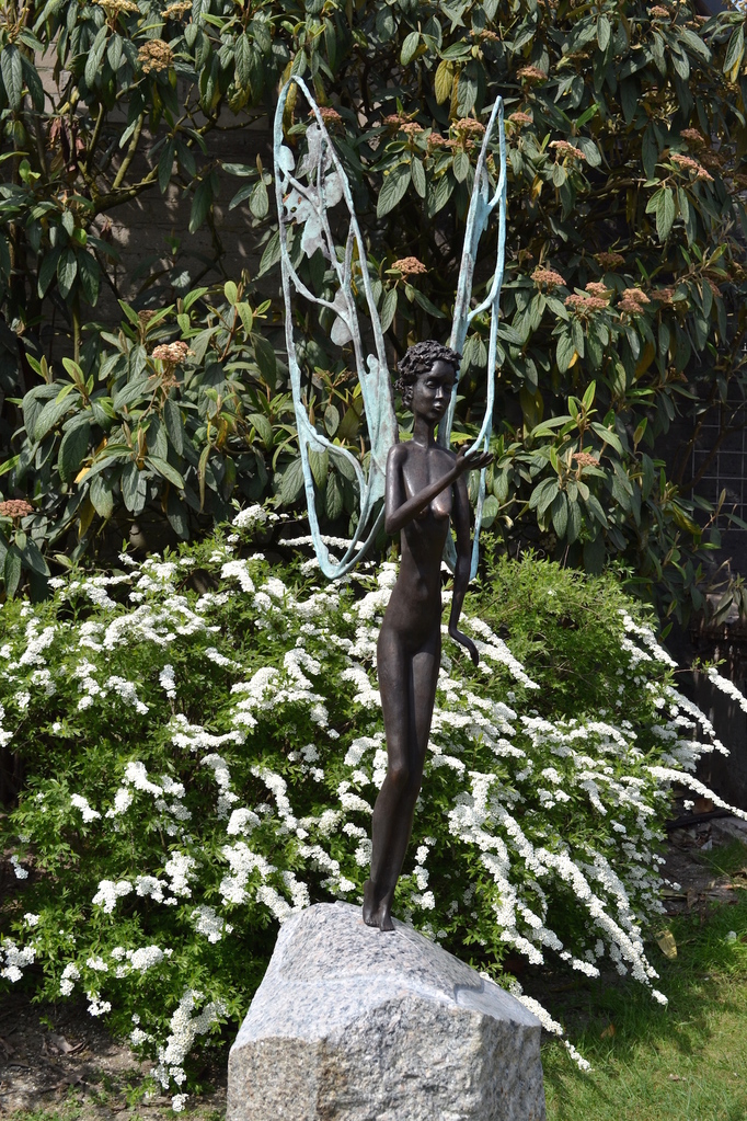 Een libelle-achtige fee blaast naar de toeschouwer en betoverd deze. De fee is van brons en staat op een golvend lelieblad van graniet.