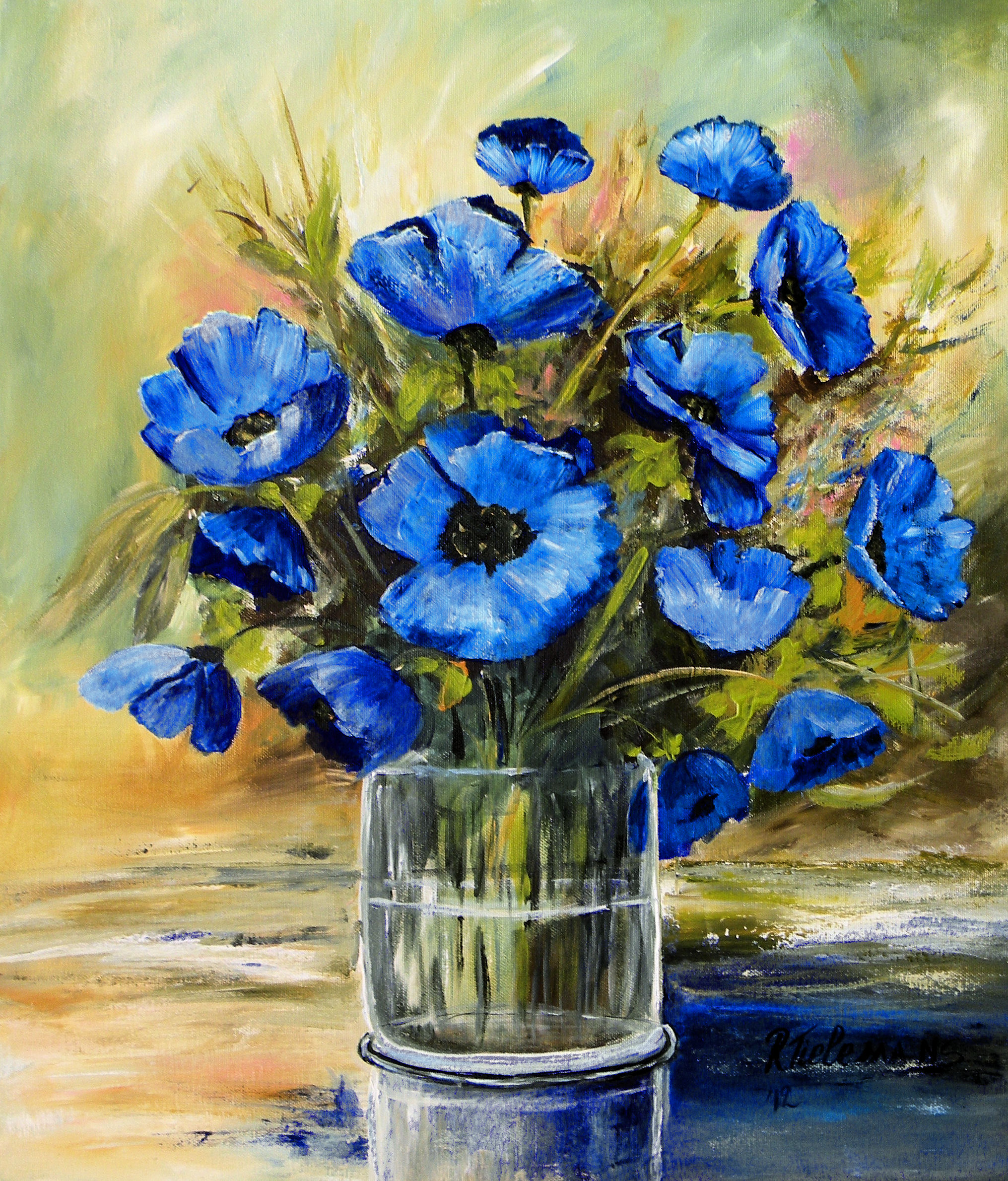 Blauwe Papavers, acrylverf schilderij van bloemen