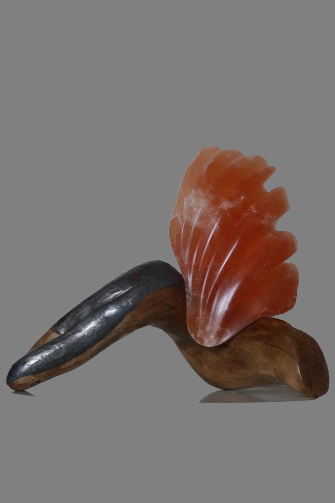 Budding Light is gemaakt seleniet, gevonden hout en, lood. Binnenin zit led verlichting.