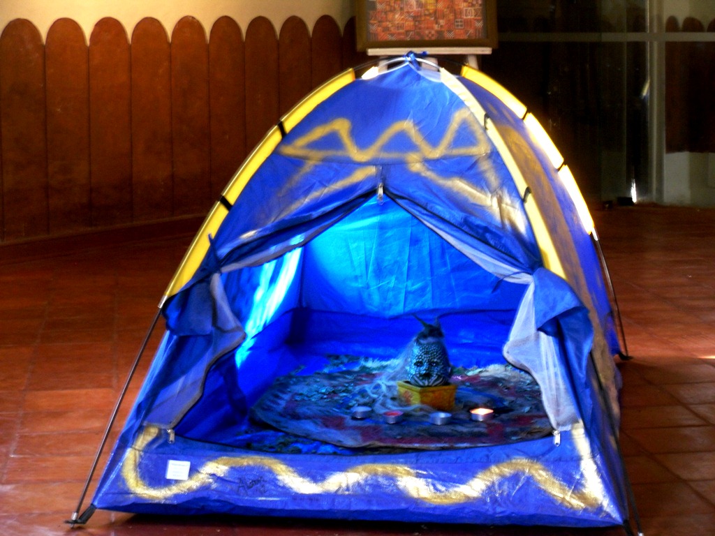 Een nieuwe versie van Moeder Aarde, in 2012 voor mijn expositie in Cajamarca/ Peru. In bewaring bij een klant (disoctheek El Tayta) in die stad waar de tent en de keramisch pot verdween.