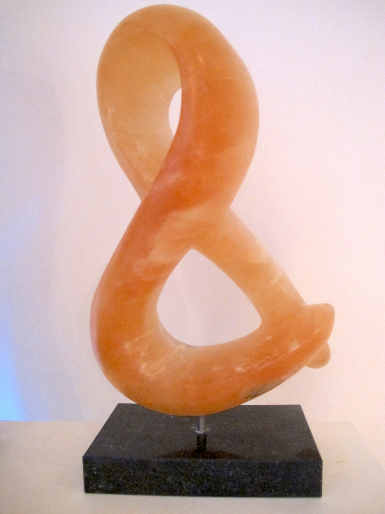 Abstract beeld van seleniet uit Marokko. Staande, opengewerkte vorm. Kleur oranje transparant. Het beeld is geplaatst op een zwarte, hardstenen sokkel