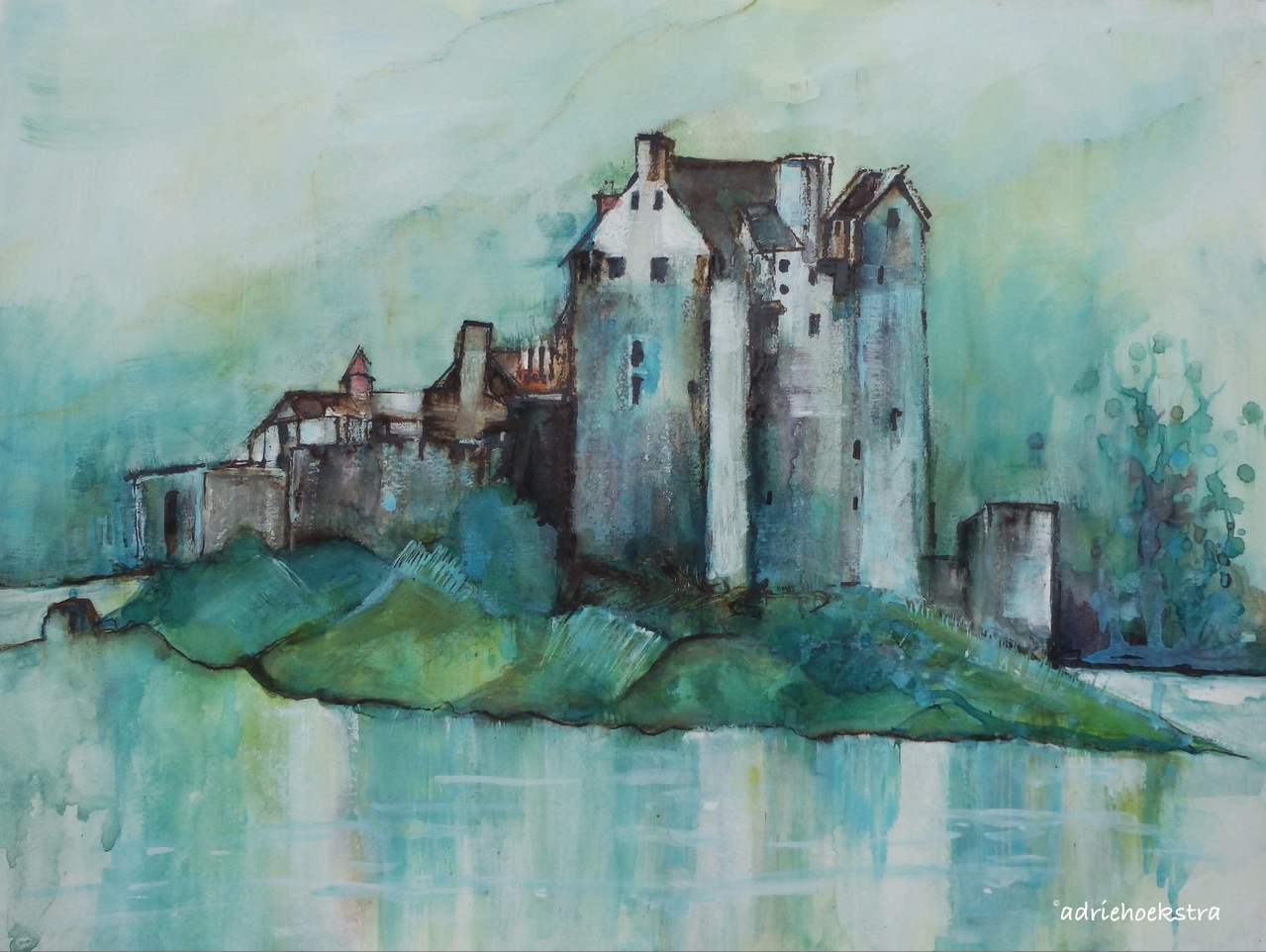 Schots kasteel, gestart als aquarel en daarna lagen met verschillende materialen zoals: acryl, gesso, pastelkrijt en bister.