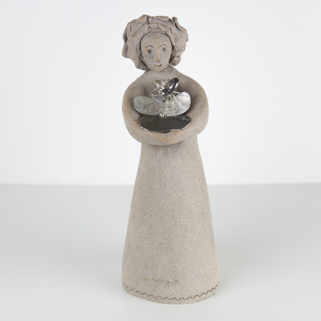 viooltje (speld met spin, zilver): 4 x 5 cm; beeldje (steengoed, ongeglazuurd): 22 x 8 cm