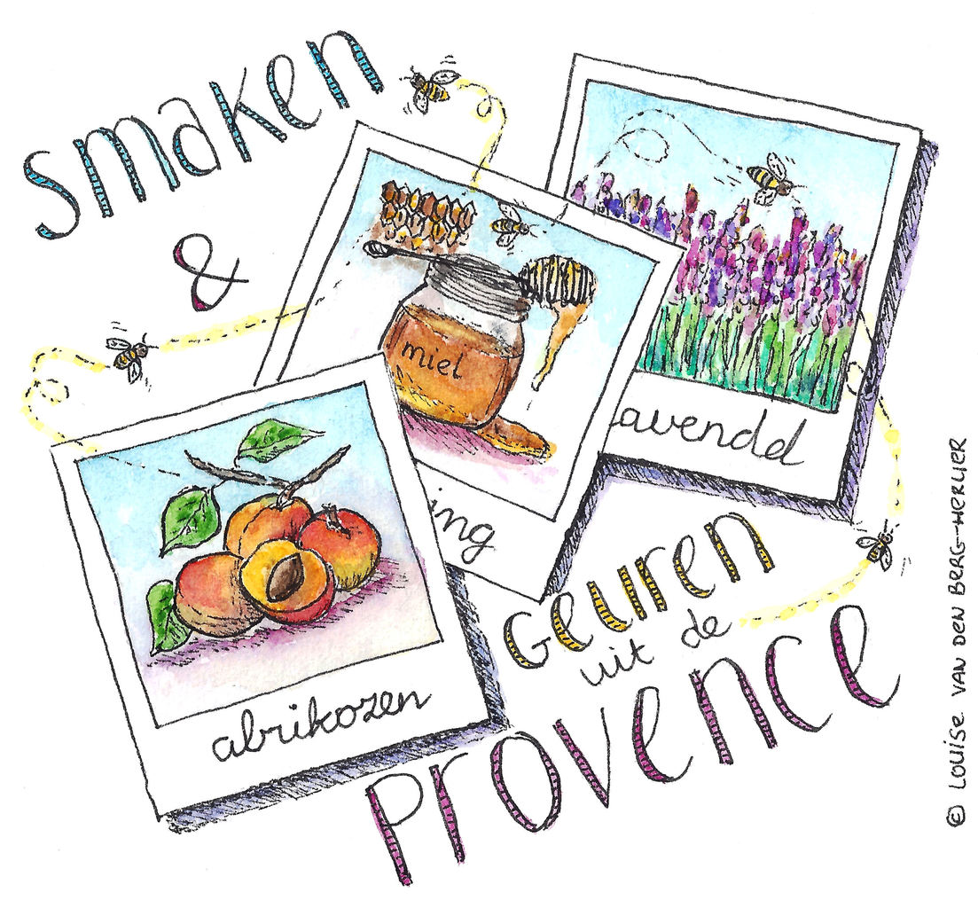 Illustratie in pen en aquarel bij het recept van Abrikozen Galette met Honing en Lavendel op www.keukenatelier.com