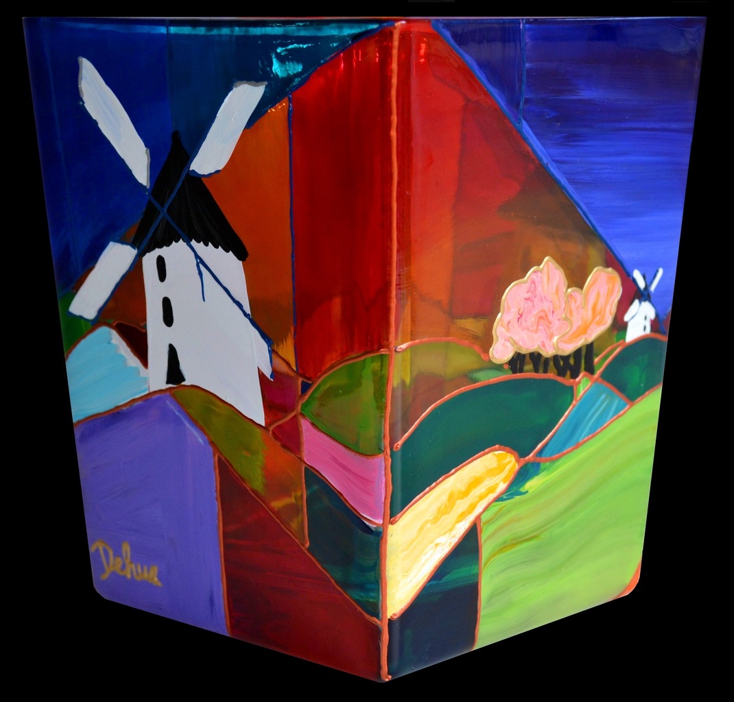 Handbeschilderde glazen vaas 6, ook te gebruiken als windlicht. Met een theelicht erin geeft het een prachtig kleurenspel en schouwspel op de muur Beschilderd met een kleurrijk Fantasielandschap met windmolens verdeeld in kleurvlakken Hoogte 17 cm, doorsnede (vierkant) 14 cm Inclusief certificaat van echtheid