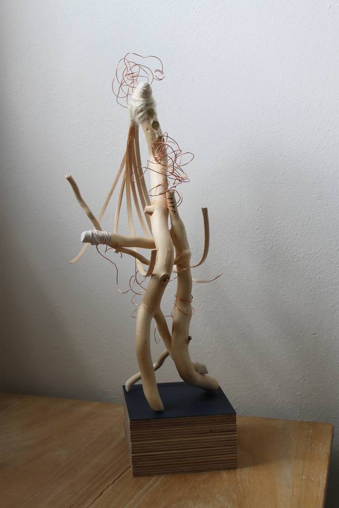 Twee flamboyant, opgetuigde, dansende figuren. wilgenhout, koper, touw, pitriet.