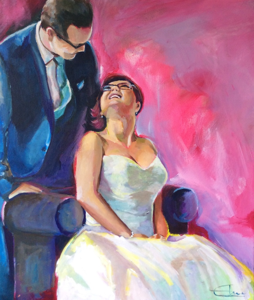 Schilderij Wit Blauw Acryl Portret Roze Huwelijk Bruid Bruidegom Kleur Verliefd Trouwen Bruidspaar Sprankelend