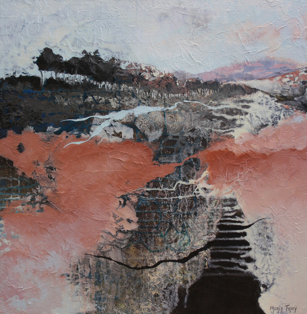 Marly Freij maakt grote kleurrijke, maar ook meer ingetogen schilderijen in gemengde techniek, met name sferische landschappen en abstracte composities