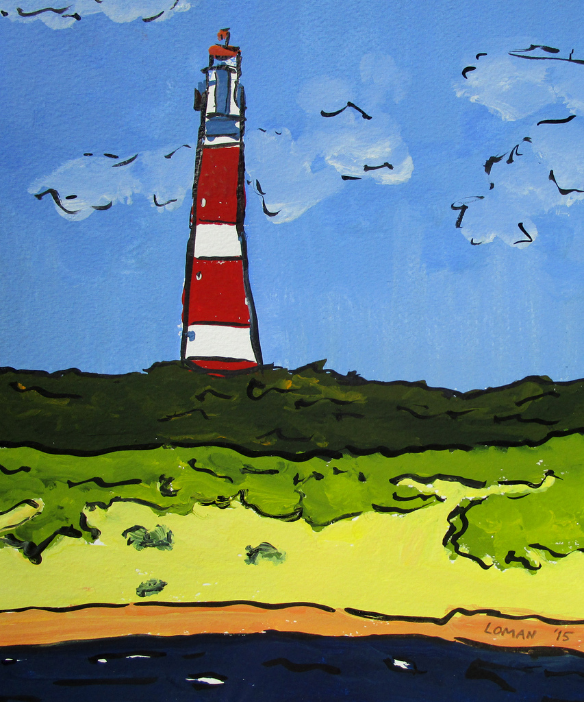 Vuurtoren Duinen Wolken Struiken Rood Wit Blauw Groen Geel