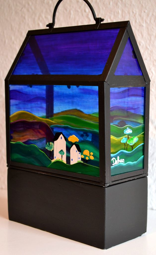 Handbeschilderd huis van glas, aan alle kanten verschillend beschilderd. Landschap met huisjes, heuvels en bomen in wit, geel, groen, violet, turquoise, blauw en zwart. Metalen frame met handvat. Het glazen huisje staat op een bakje van steen. Inclusief certificaat van echtheid.