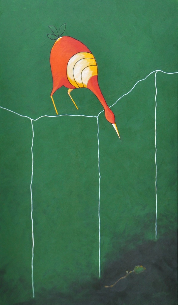 Wit Oranje Geel Acryl Vogel Groen Lijn Kijken Verwondering Diepte Klif Hoogte Afgrond Twijg