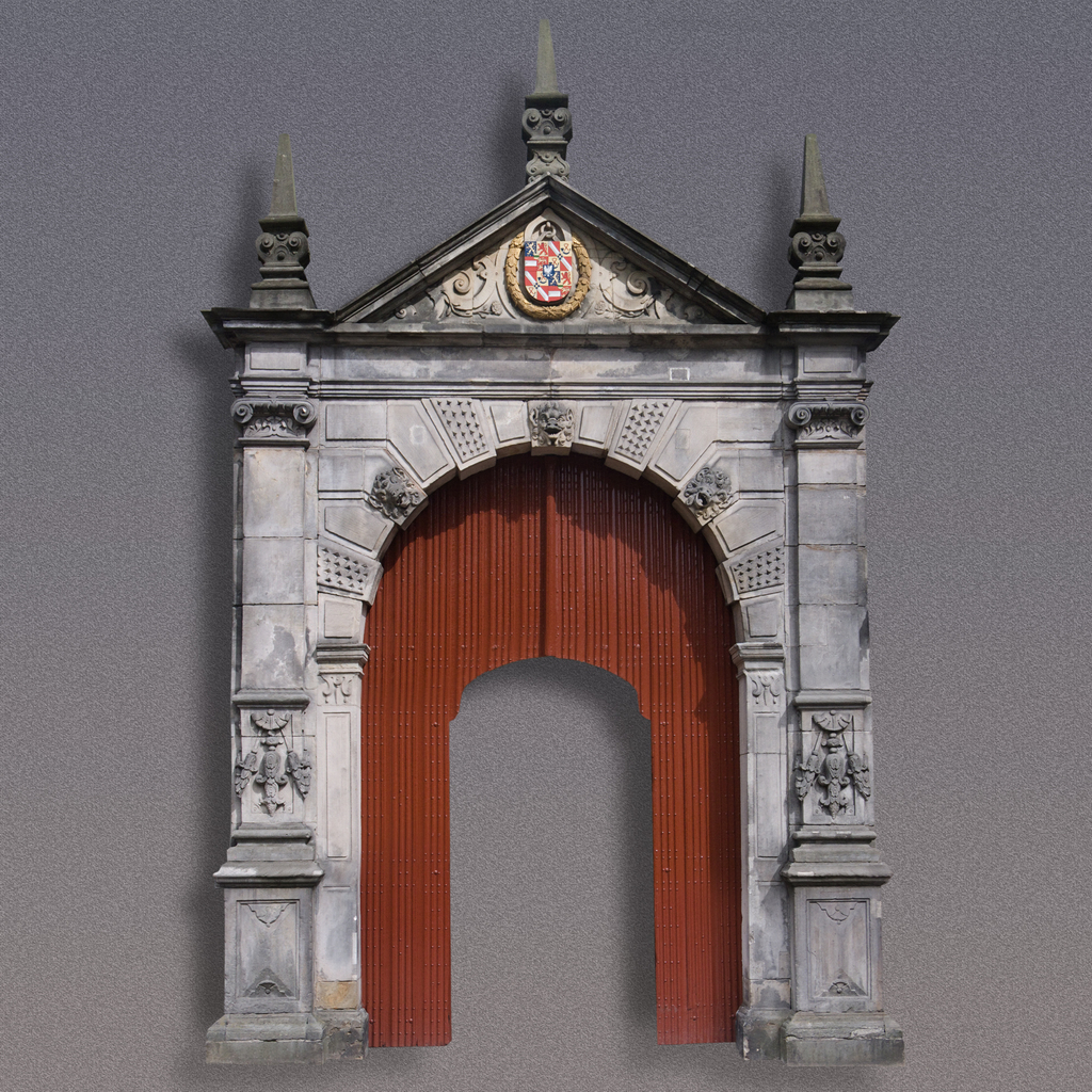 toegangspoort naar het Prinsenhof aan het Martinikerkhof. 1642, Poort met fronton bekroond door drie obeliskachtige opzetstukken