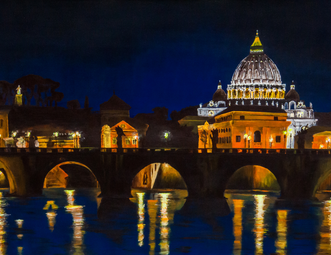 Vaticaan Stad bij zonsondergang met weerspiegeling in de rivier de Tiber. Dit schilderij is niet ingelijst.
