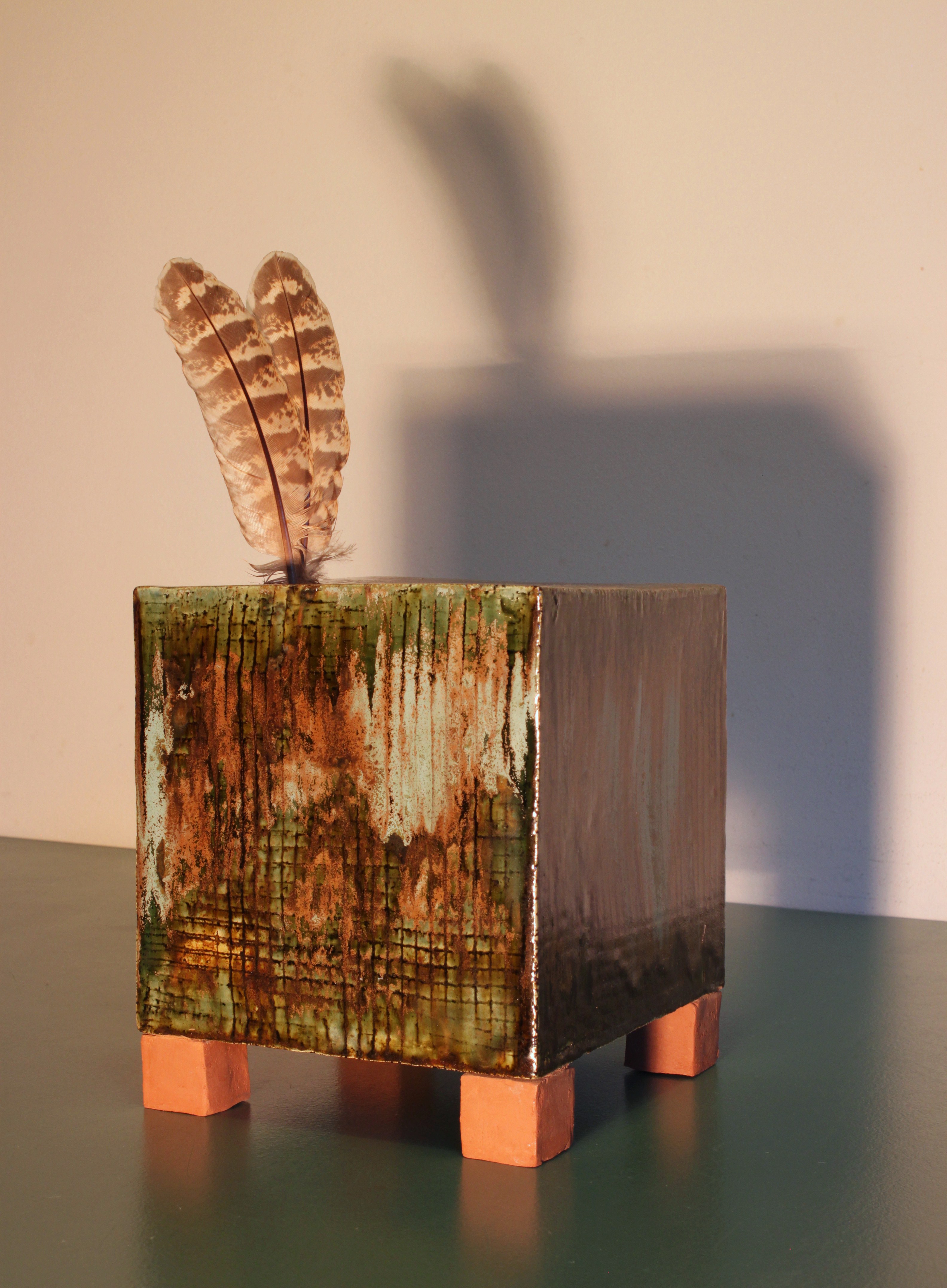 een impressie van een oerbos, keramiek met bosuil veren.