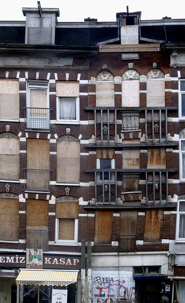 Een blok huizen aan de Janpieterheyestraat in amsterdam, zwaar beschadigd door een gasexplosie. Momenteel is het complex gesloopt.