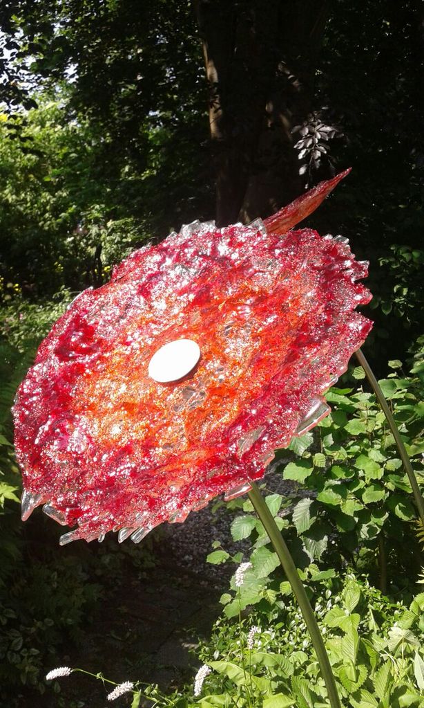 rode bloem, lace techniek op blank glas gefused, roest vrij stalen steel