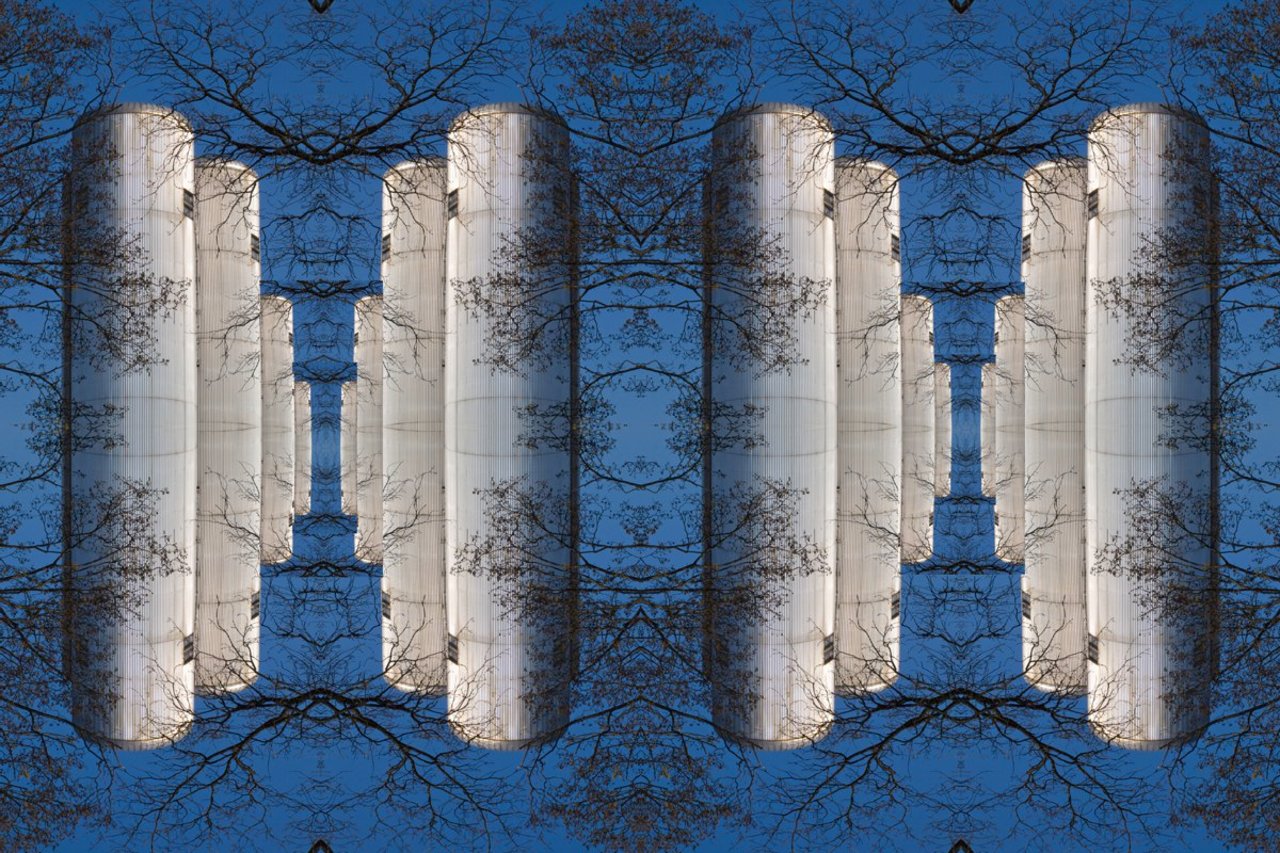 Een eigenaardig landschap, gemaakt door de herhaling van een enkele foto. Fragmenten van een foto zijn herhaald en gespiegeld aan elkaar geplakt. Hierdoor ontstaat een abstract beeld van een silo met een tak ervoor Het werk is te koop in allerlei maten foto 2011-3